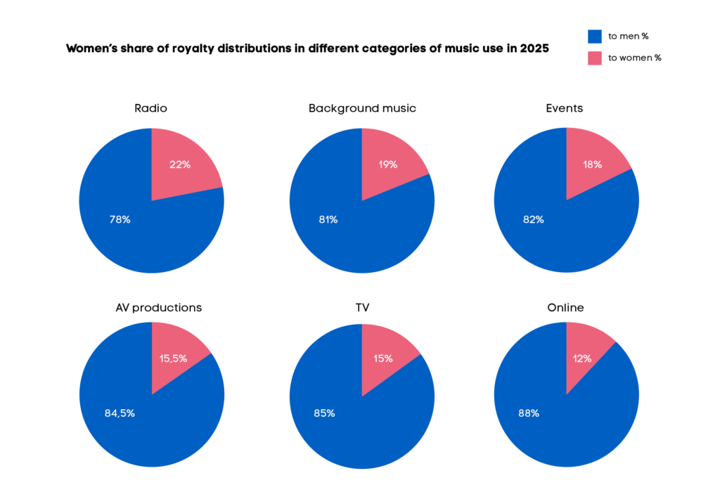 Certain channels seem to be particularly favourable to women. Of the royalties paid for radio play, 21.6% were allocated to women, which is one percentage point higher than in the previous year. The strongest growth was in royalties paid for live music, where the women’s share was 17.9% – an increase of 1.6 percentage points from last year. In the online area of digital channels, however, the women’s share is just over 10% of all royalties.