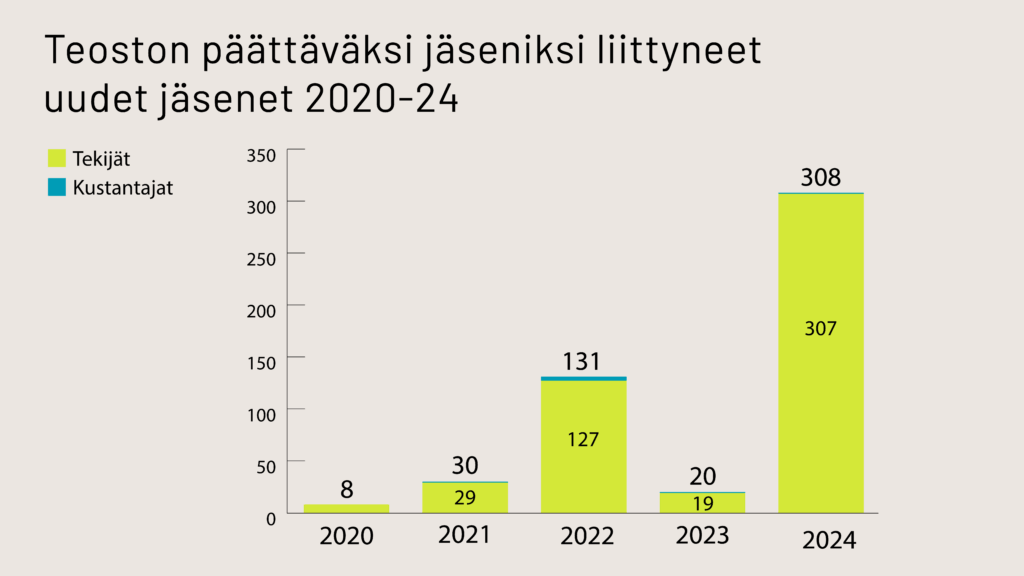 Teoston päättävän jäsenistön määrä kasvoi aktiivisen jäsenhankinnan seurauksena. Vuonna 2024 jäseniksi liittyi ennätykselliset 308 uutta jäsentä (307 tekijää, 1 kustantaja). Päättävät jäsenet käyttävät Teostossa ylintä päätöksentekovaltaa.