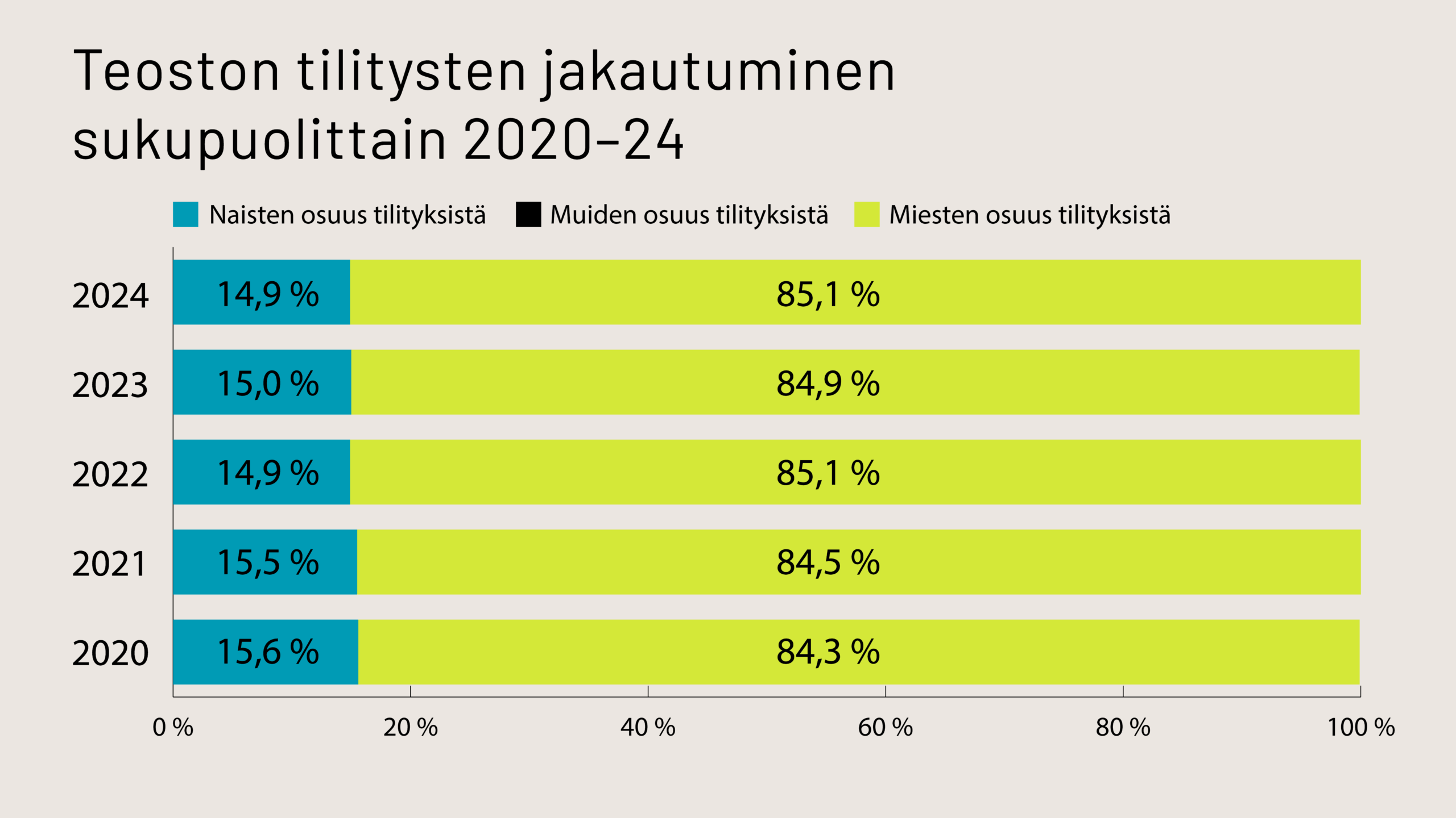 Naisten osuus Teoston musiikin tekijöille maksetuista tilityksistä on ollut useita vuosia noin 15 prosenttia.