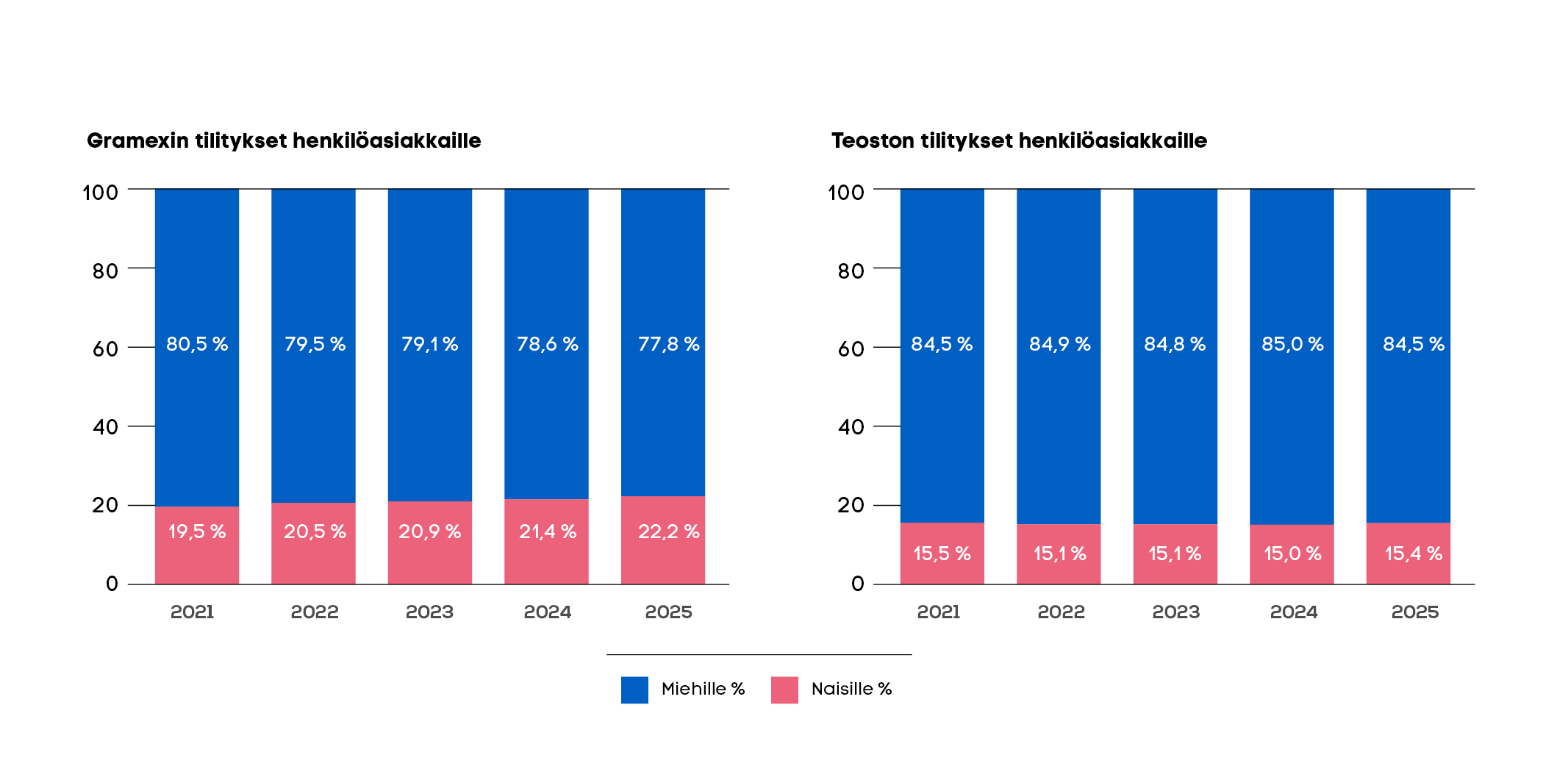Vuonna 2025 naisten osuus musiikin esittäjissä ja tuottajissa oli 25,3 prosenttia (2024: 25,2 %) ja musiikin tekijöissä 21 prosenttia (2024: 20,9 %). Vaikka muutokset ovat hitaita, sekä Teoston että Gramexin tilastot osoittavat kehityksen jatkuvan samaan suuntaan. Uusissa, vuonna 2025 liittyneissä asiakkaissa naisten osuus on Gramexissa 26,8 ja Teostossa 25,5 prosenttia.
