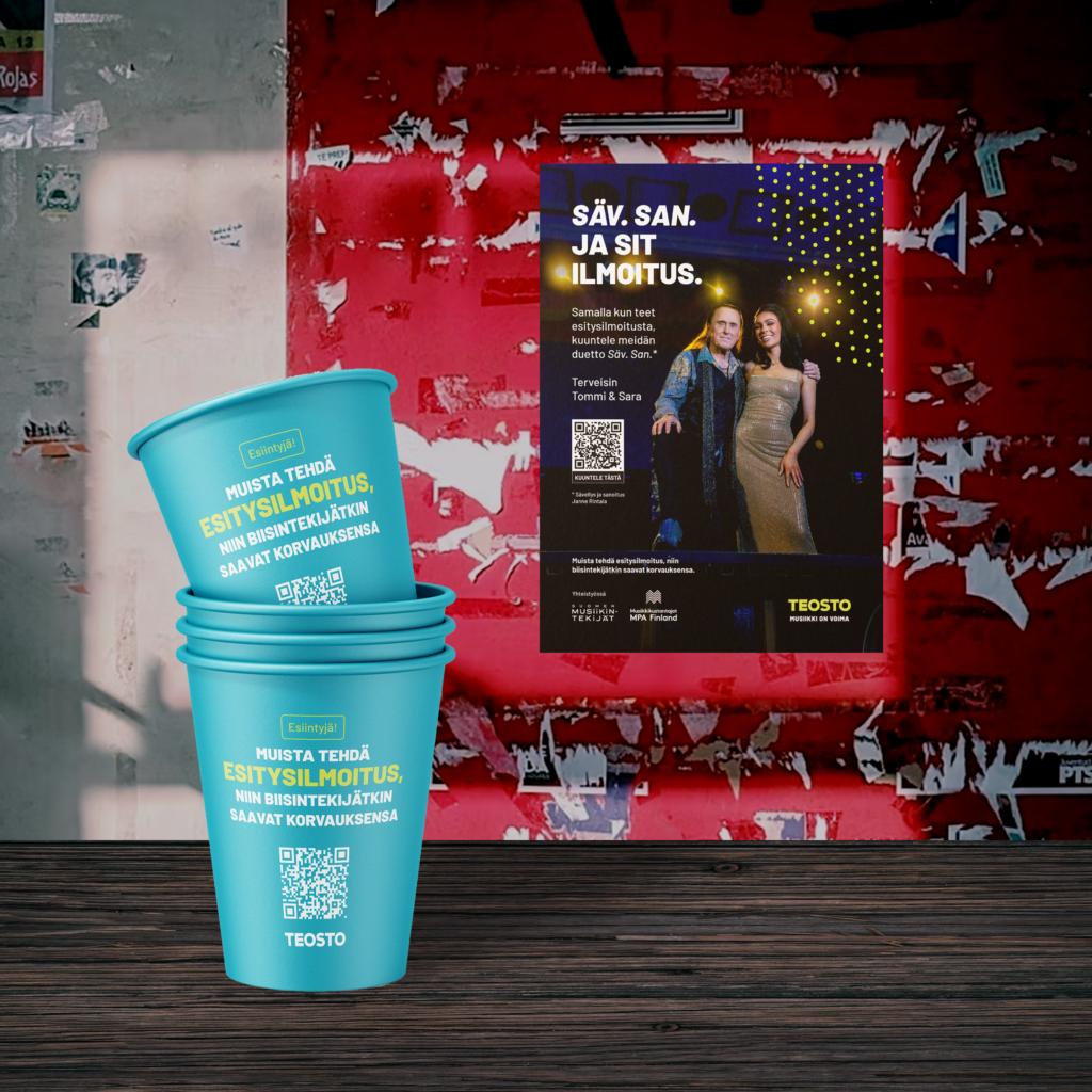 Osana kampanjaa suunnittelimme bäkkärille esitysilmoituksista muistuttavan paketin, joka sisältää kampanjanjulisteen sekä pahvimukeja.