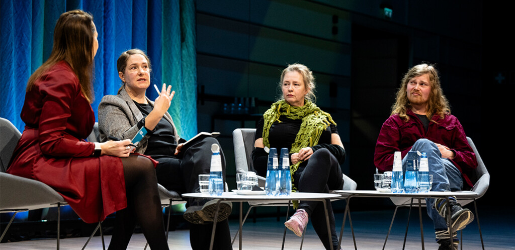 Teosto Talksin paneelikeskustelussa Antti Autio, Jenna Lahtinen ja Jonna Paananen keskustelivat Vappu Auran johdolla siitä, miten jo koronasta ja kustannusten noususta kärsinyt Suomen elävän musiikin kenttä saataisiin pidettyä elinvoimaisena myös tulevaisuudessa.